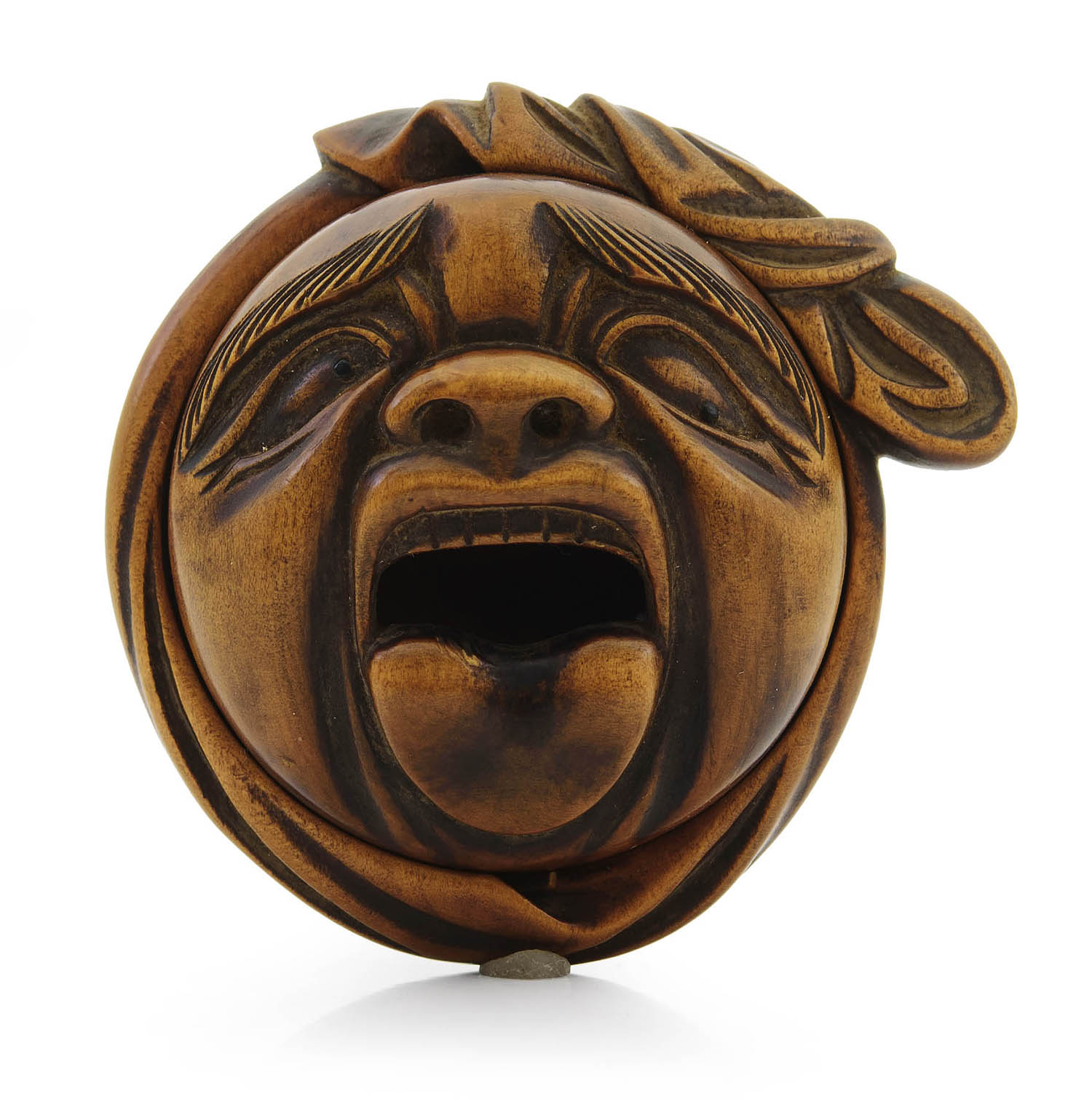 Of a contorted face with mouth open, the top section unscrewing from its 'top knot' hairstyle. Manju are flat rounded netsuke, usually in two parts, named after the Japanese rice cake traditionally eaten at new year, 6 x 6cm