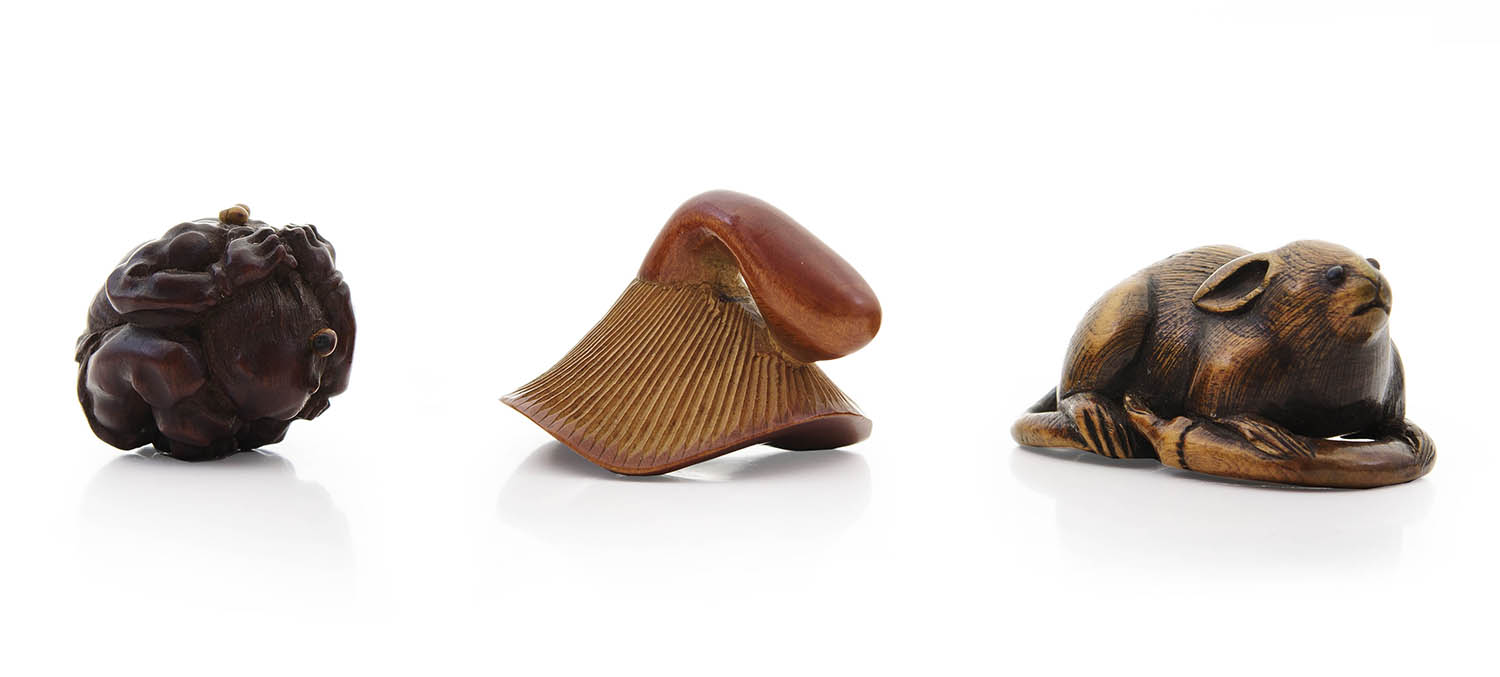 Group of three works in wood including the classic subject of the Setsubun (New Year Festival) and Oni (Devil) that is trying to take shelter from beans being thrown at him; the second a realistic mushroom; the third a mouse with inlaid horn eyes. (3)