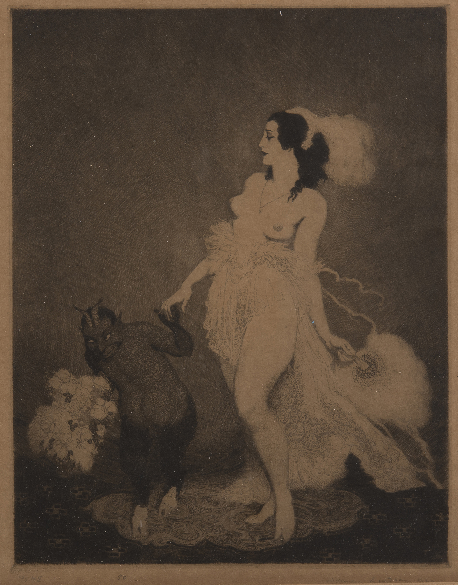 The work displays substantial discolouration and some foxing. The work has slid in the frame, revealing what appears to be an old adhesive line around the edge of the paper. The mount is severely discoloured. It is highly recommended that this work is reframed.