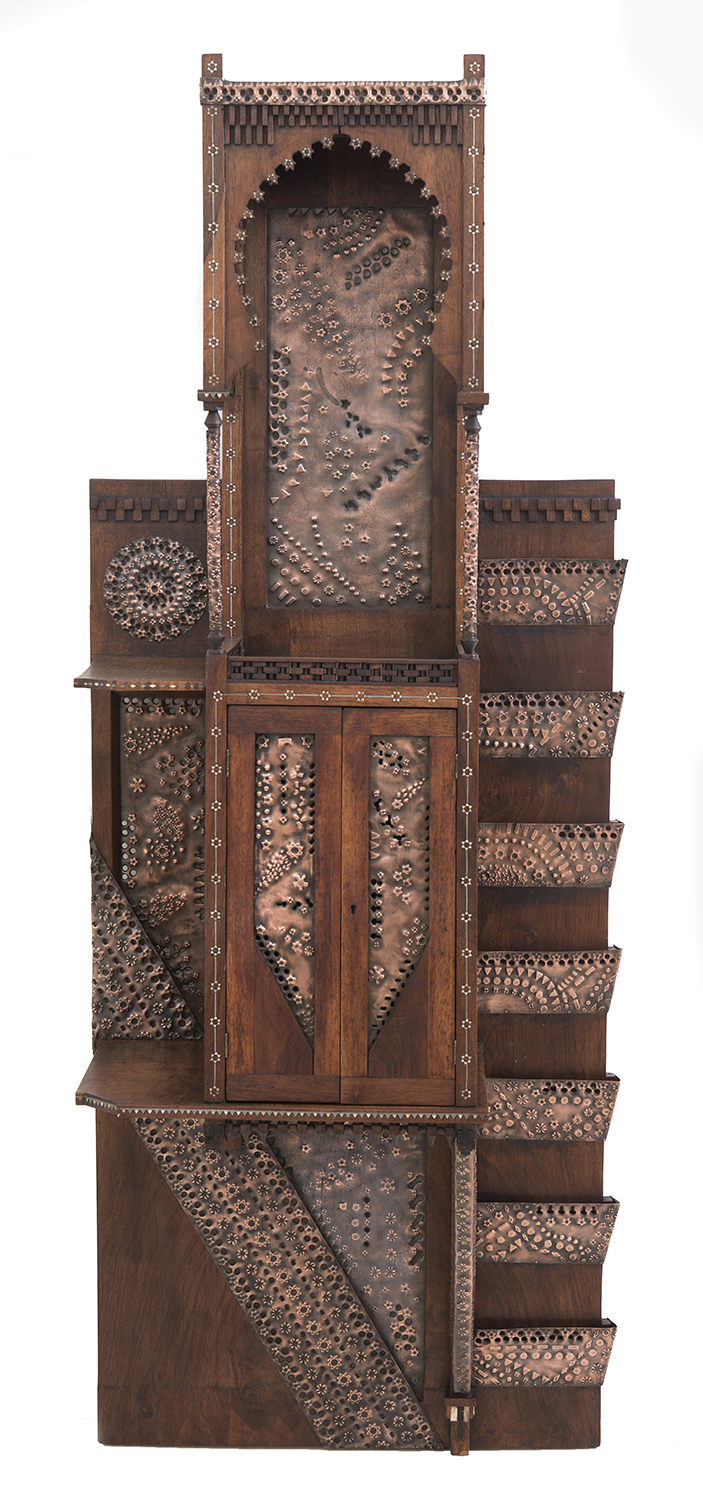 Repousse and perforated with metal and bone inlay, 35 x 54 x 54 cm