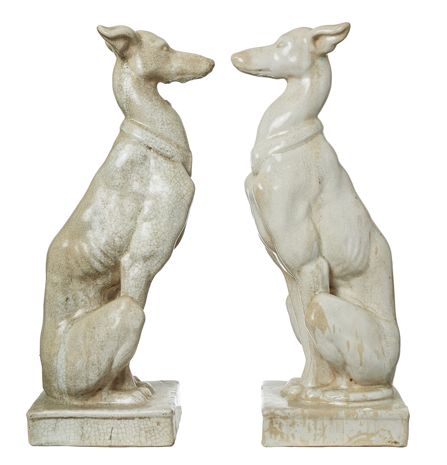 A LARGE PAIR OF ITALIAN CRAQUELURE CREAM GLAZED FLOOR STANDING GREYHOUNDS, 20TH CENTURY