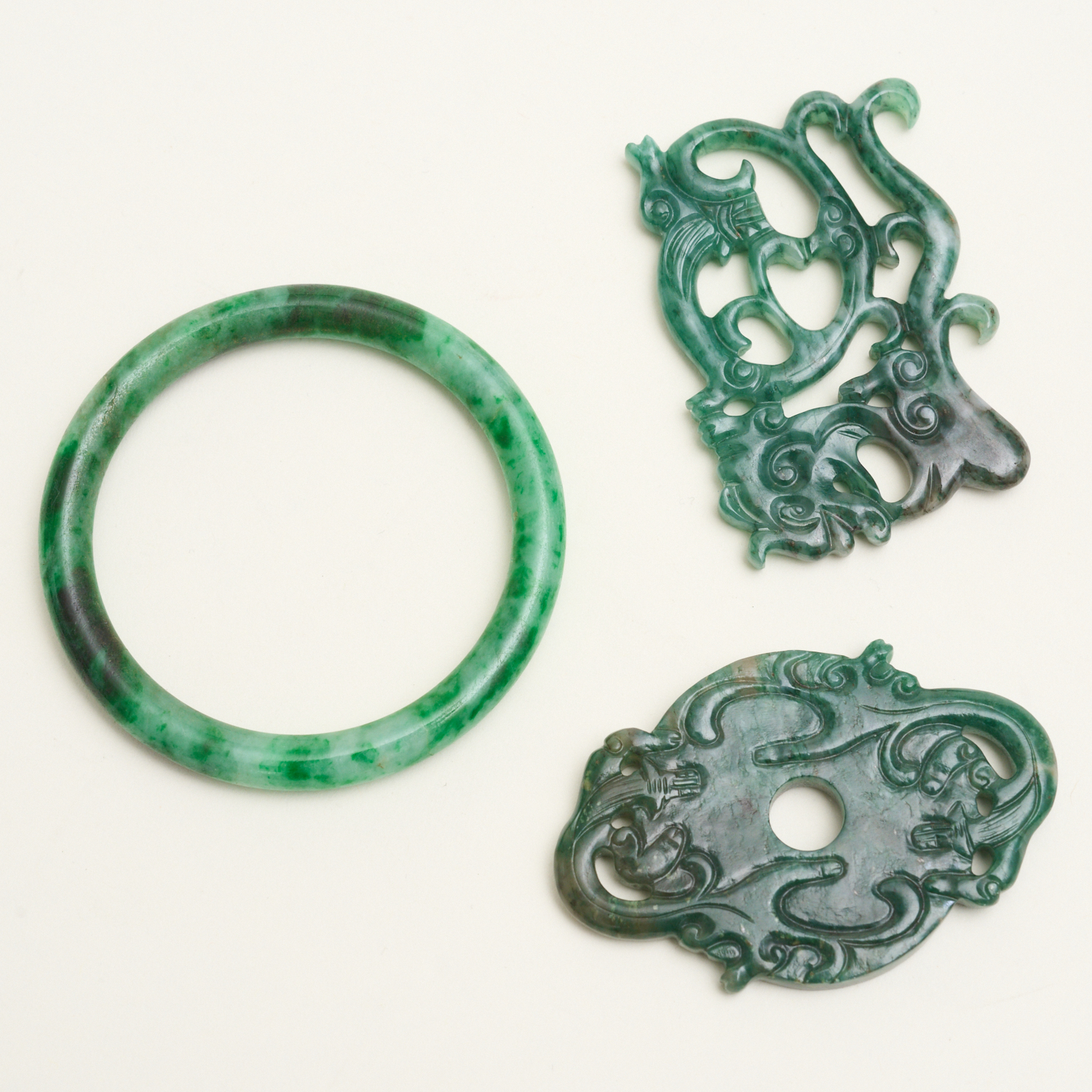 THREE PIECES OF CHINESE CARVED GREEN JADEITE, LEONARD JOEL LOCAL DELIVERY SIZE: SMALL