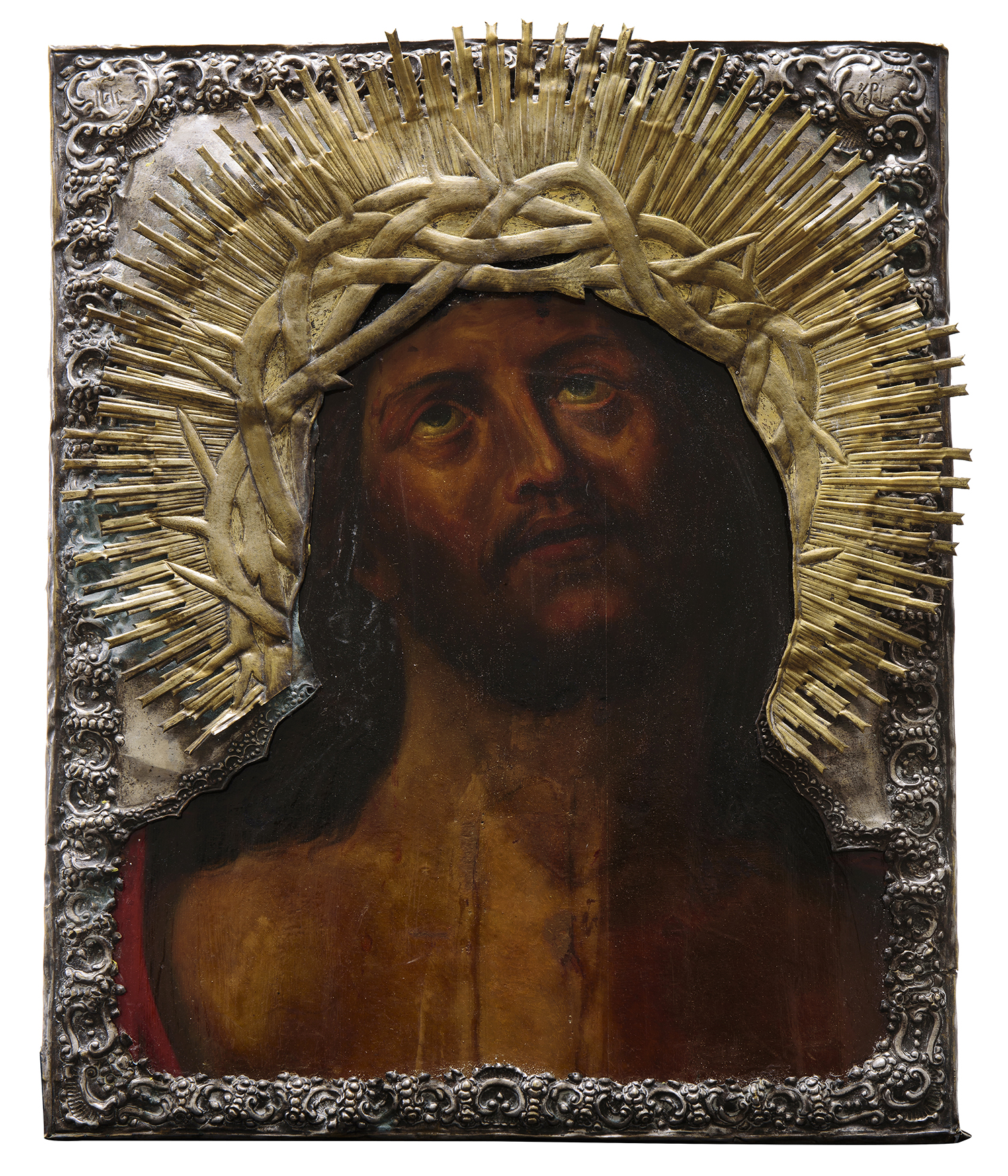 wear and tarnish to silver and metal overall. areas of over painting visible to neck and chest.