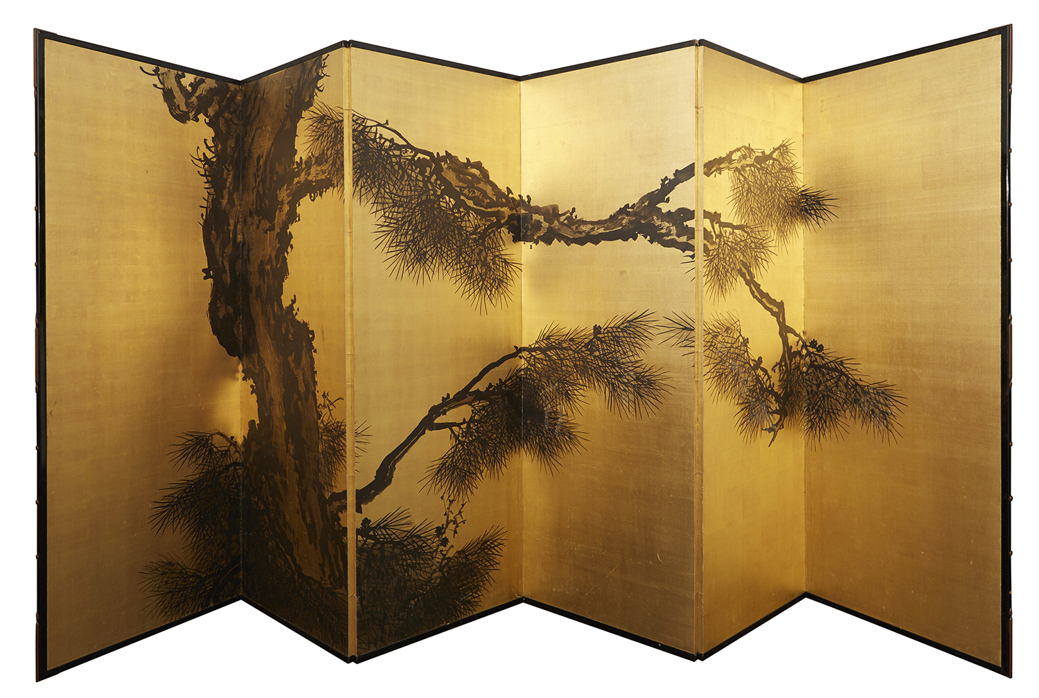 A single pine tree with branches aloft in ink, mounted in black lacquer frame, each panel 166.5 x 61.5cm