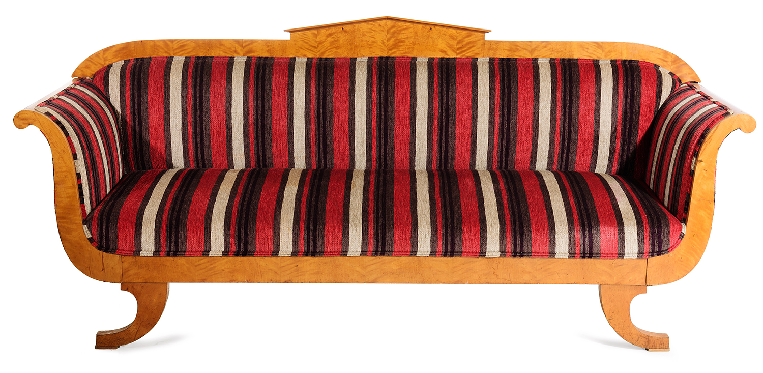 With shaped back pediment, upholstered in striped fabric, over splayed legs, 106 x 242 x 72cm