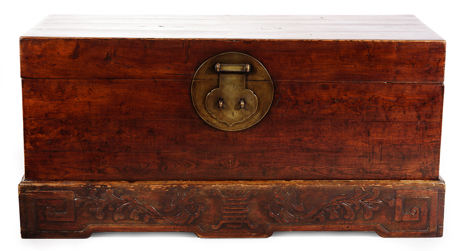 Rectangular, the lid opening to a storage cavity, seated on a pedestal base, 85 x 176 x 75cm