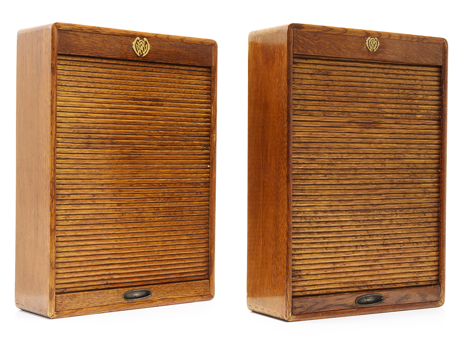 Each with a single tambour door, bearing the monogram of William Percy Wilkinson, 36 x 25.5 x 9cm