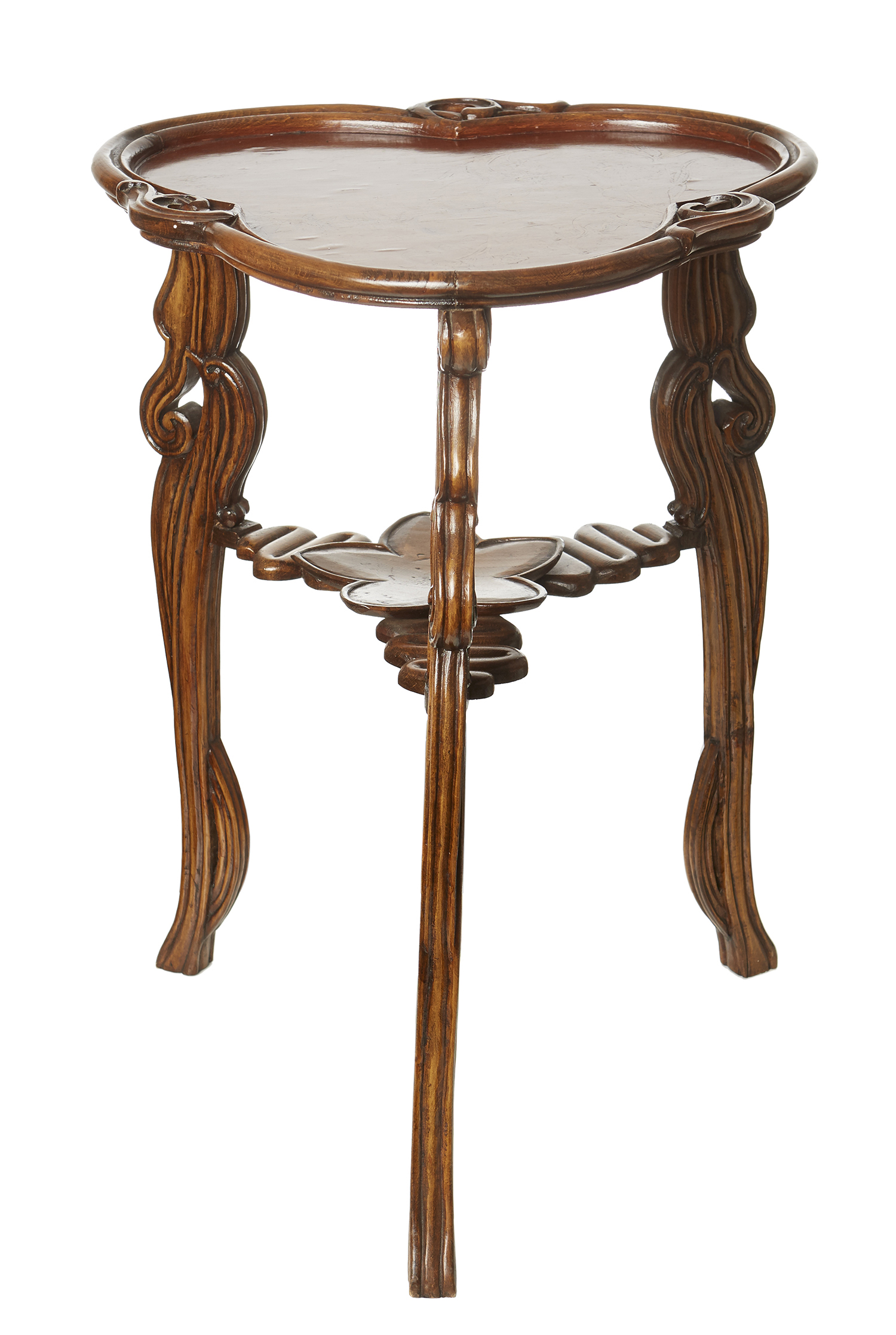 The clover shaped top with floral spray marquetry on organically moulded foliate form legs, the open stretcher shelf in the form of a flower, 76 high