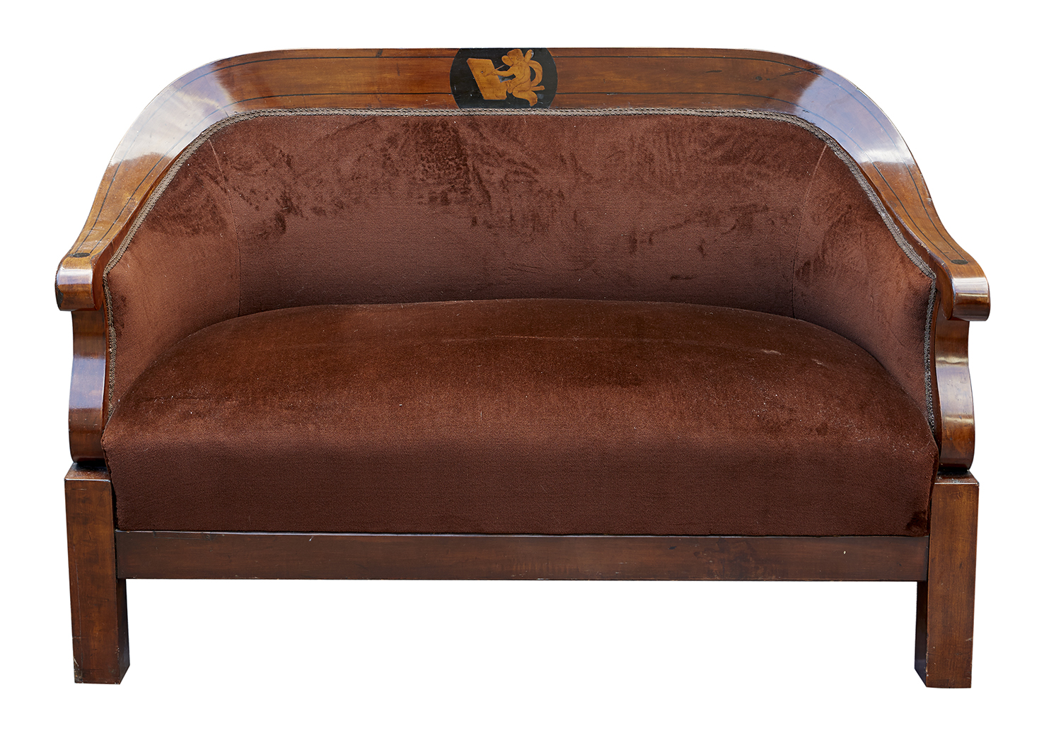 The back with artist putti marquetry, upholstered in dark brown velvet, 88 x 132 x 66cm