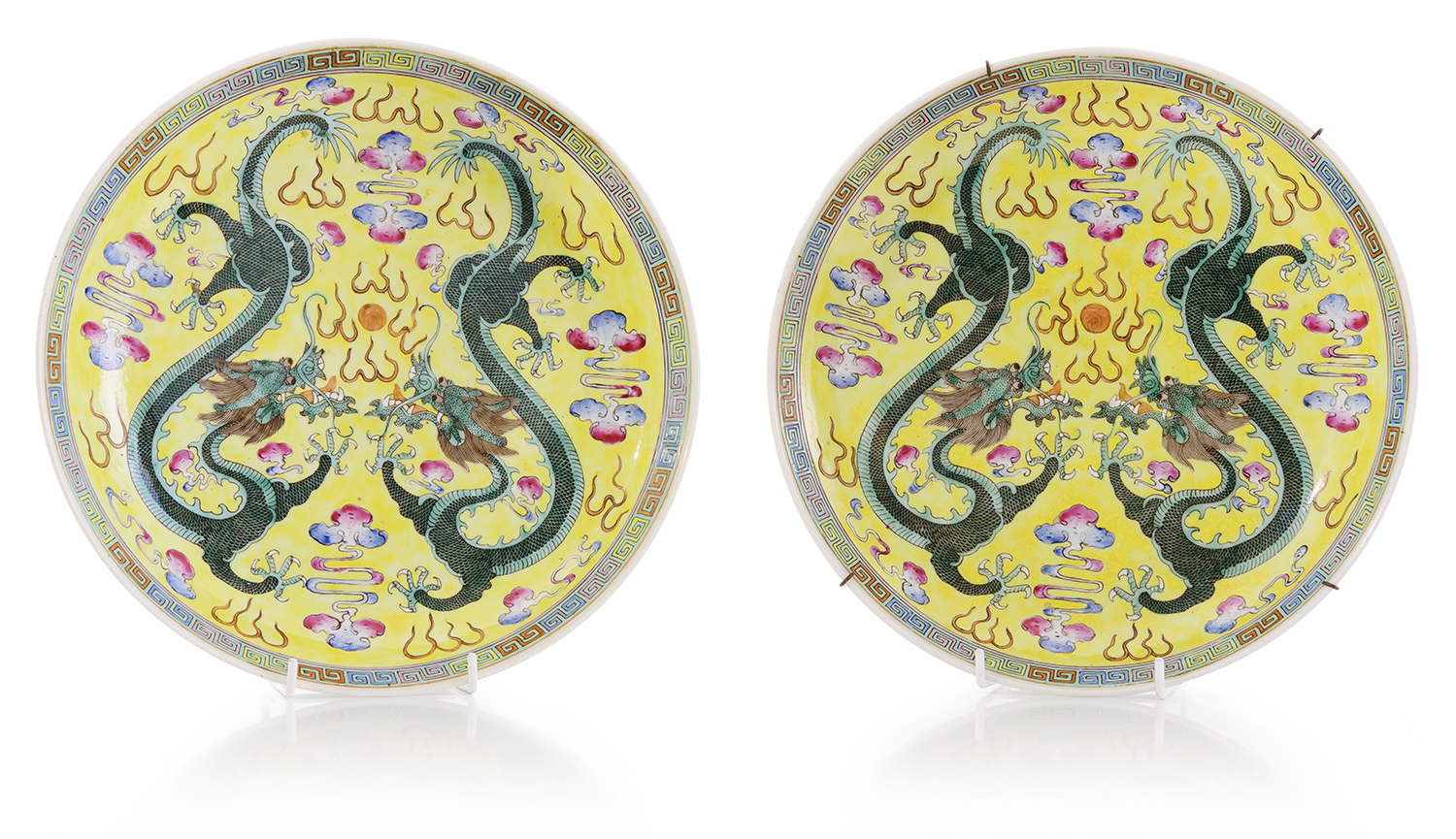 A PAIR OF CHINESE POLYCHROME DRAGON PLATES