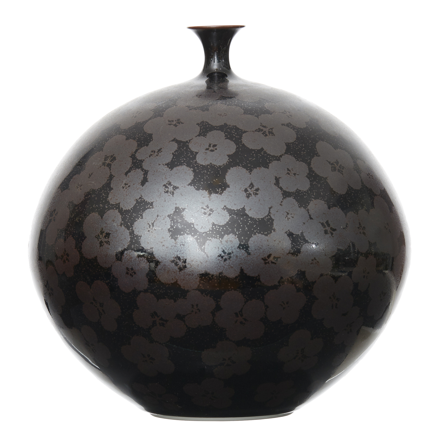 With black tone on tone plum blossom design, with signed accompanying Tomobako (presentation box), 24cm high