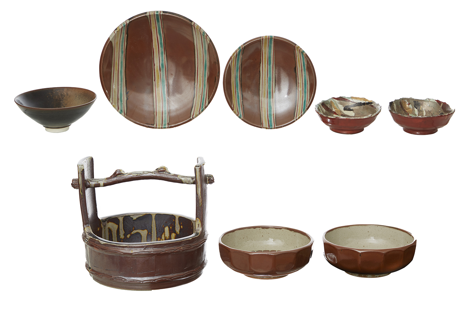 The largest dish 28cm diameter, together with a contemporary Japanese studio pottery water carrier, 20th Century, 26.5cm (8)