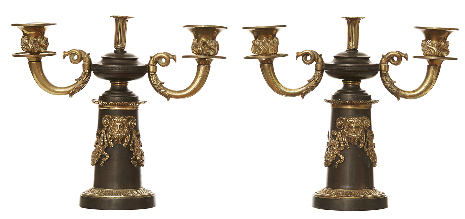 Of squat form with three lights above columns with applied gilt bronze masks connected with laurel swags, 28cm high.