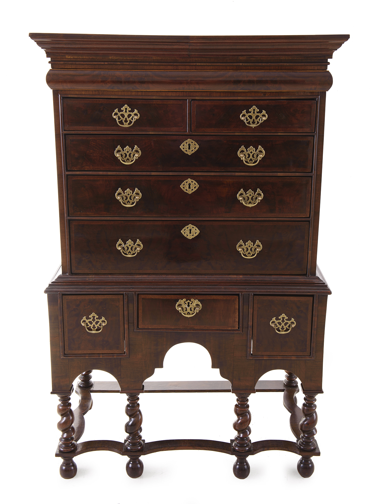 Rectangular in form, with eight drawers each with elaborate brass handles, the whole raised on barley twist legs united by a shaped stretcher base, 163.5 x 102 x 57cm