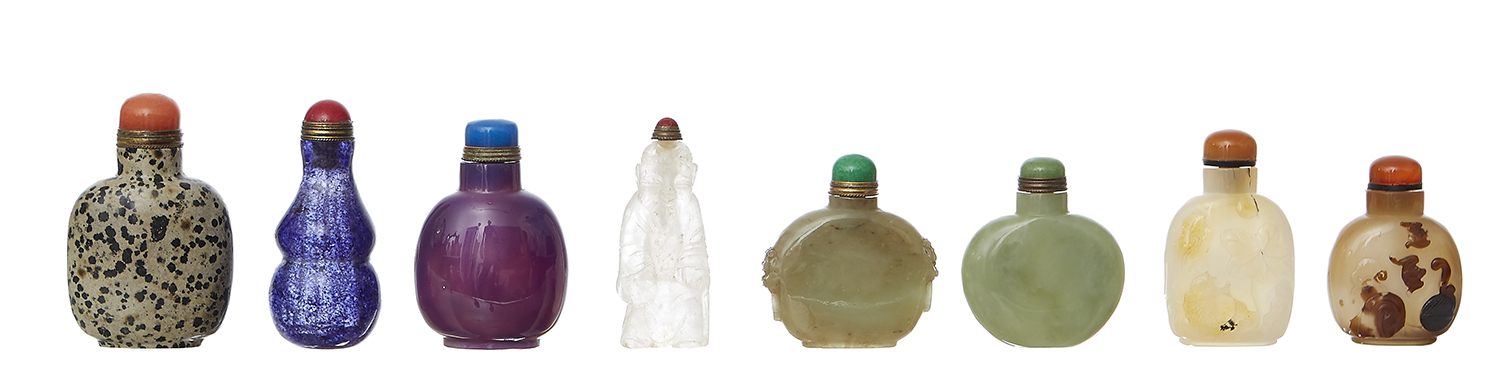 Comprising two jade snuff bottles of flatenned ovoid form, the first in spinach jade with mask form handles to shoulders, the second in pale green jade, each 6cm high, together with various hardstone and crystal bottles including both carved and smooth examples, tallest 8cm high (8)