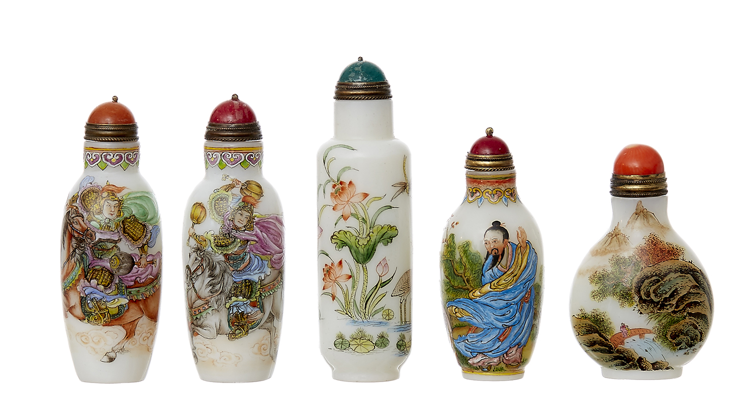 Including cyllindrical, squat ovoid, and meiping forms with various enamel decoration to body including a pair depicting mounted warriors, each with Qianlong mark to base, tallest 8cm high (5)