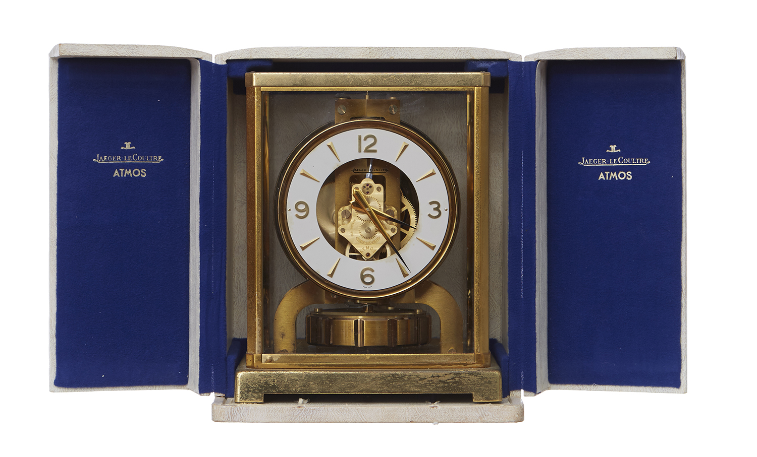 Fully glazed case with hinged front door, applied gilt-brass chapters and gilt-brass hands, the front plate stamped 'Jaeger LeCoultre, Atmos, Swiss made', with original case and papers, 22.5cm high