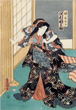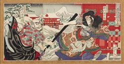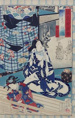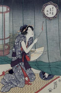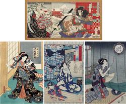 Four Oban Size prints, the first of a woman behind mosquito netting signed Gototei Kunisada ga C.1820. The second a classic actor Kabuki triptych of two warriors in a battle scene, signed Toyosai, C. 1900. The third, an actor print by Kunisada. C.1857. The fourth an actor print by Utagawa Yoshiiku (1833-1904) Signed Chokaro Yoshiiku ga with Paulownia seal. (4)