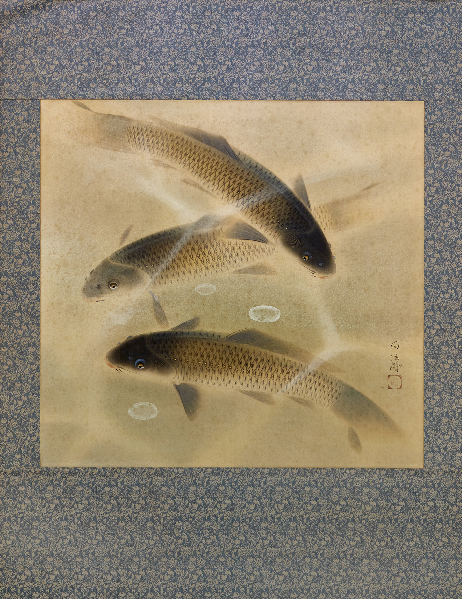 TWO JAPANESE MOUNTED WORKS - SUMI WORK ON PAPERS AND THREE CARP