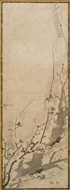 The first a work on paper of a plum blossom in horizontal format, Signed, 19th Century. The second Kakejiku Scroll painting in colours in silk of swimming carp, signed (2)