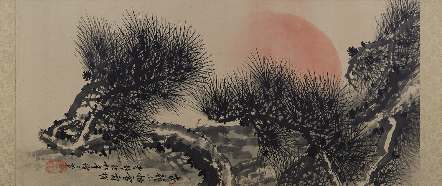 Scroll painting of the setting sun and finely rendered pine branch, 135 x 63cm