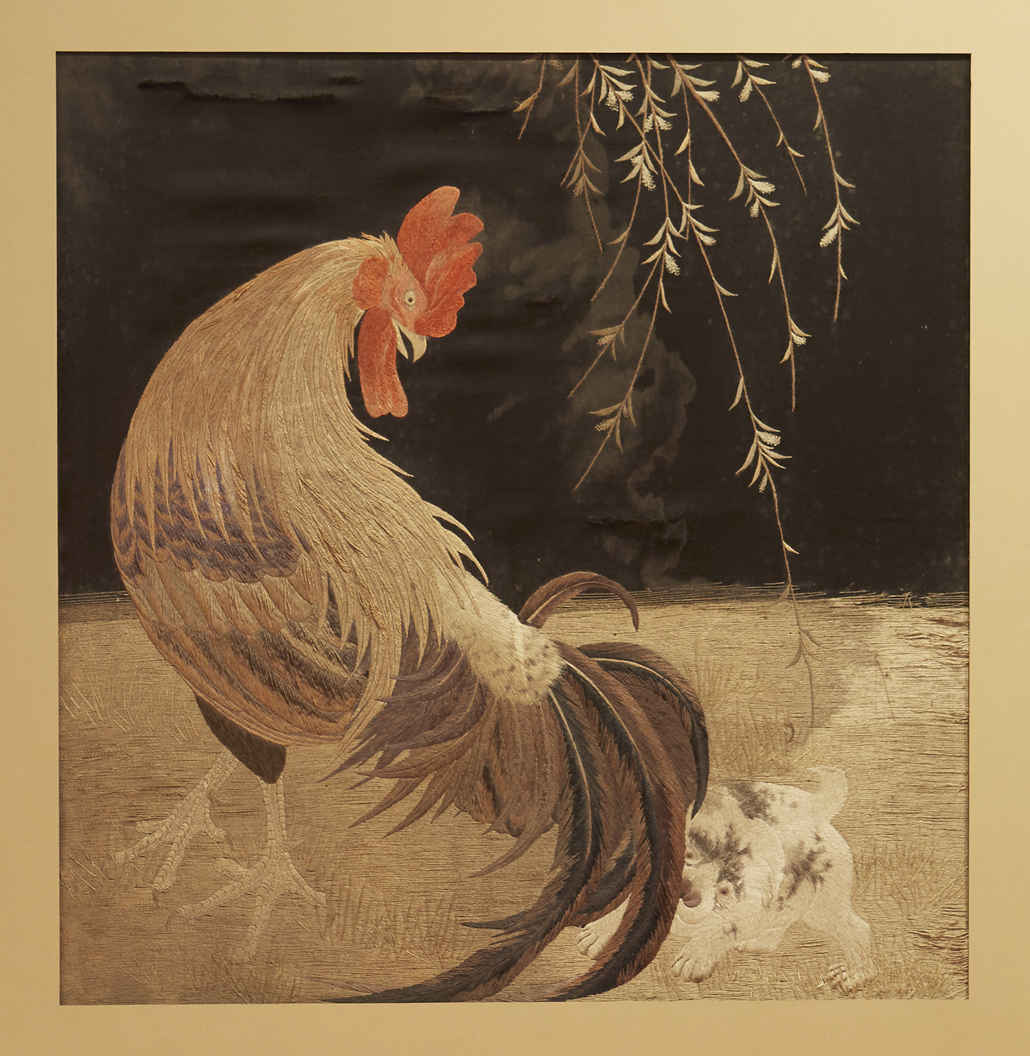 Finely articulated in silk thread, depicting a cockerel being accosted by a dog, 62 x 60cm