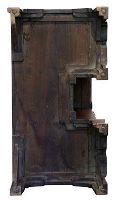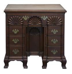 The top with moulded edge above long drawer with three carved shells, the central recessed door with shell carving flanked by two pedestals of drawers with blocked ends and moulded base with ogee feet, with hand carved components, 86 x 93 x 50cm
