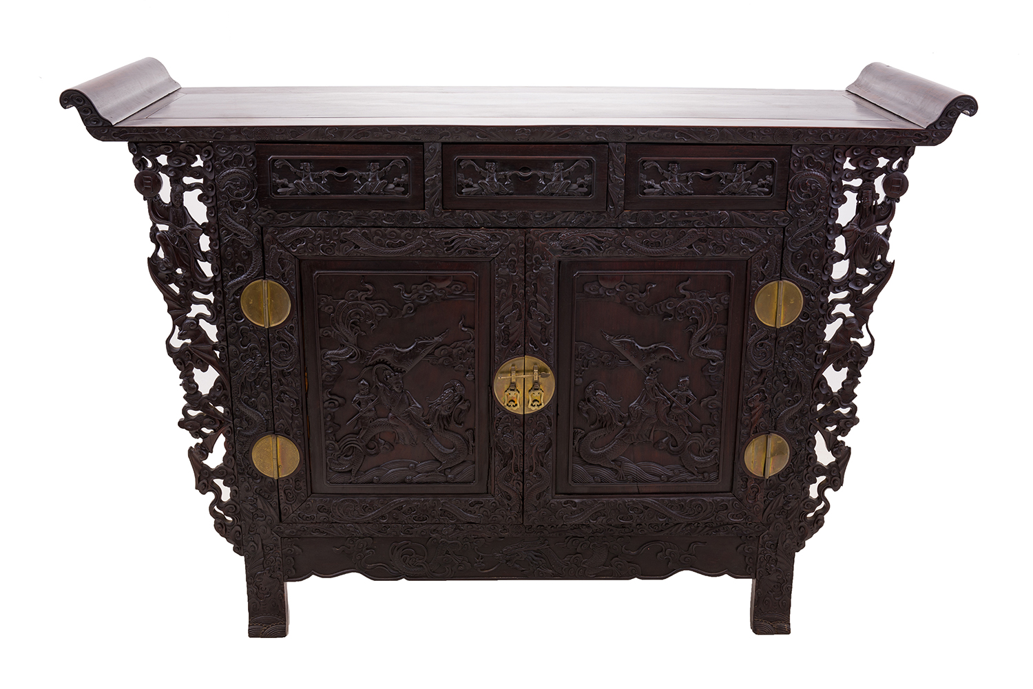 Rectangular in form, the fluted top, above three drawers an two doors, elaborately decorated overall with auspicious scenes, 123.5 x 180 x 56cm