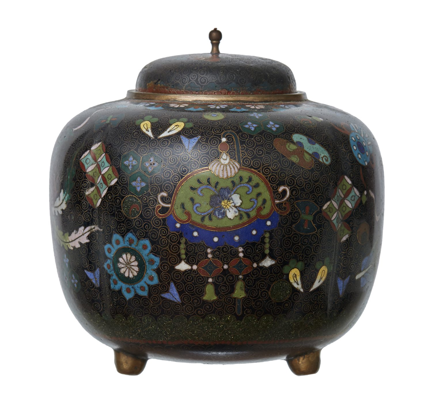 With auspicious emlems on a black ground, the interior with green enamel, set on three gilded feet, 15cm high