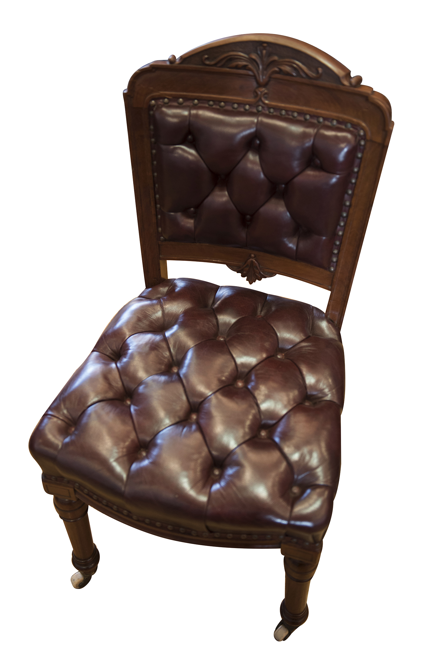 Each with a carved pediment, covered in maroon leather button back upholstery