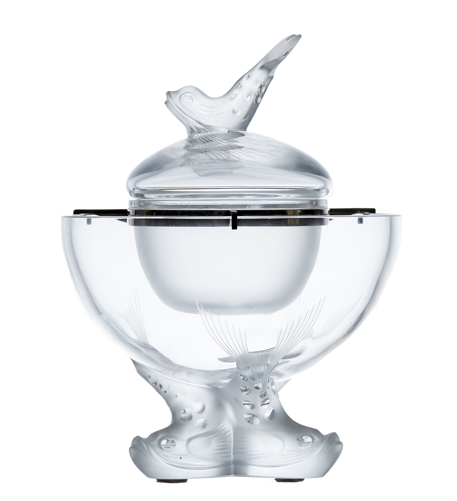 The central lidded bowl with fish finial, suspended by silver plated supports upon a larger bowl with tri-footed fish support, each bowl signed "Lalique, France", 25.5cm high