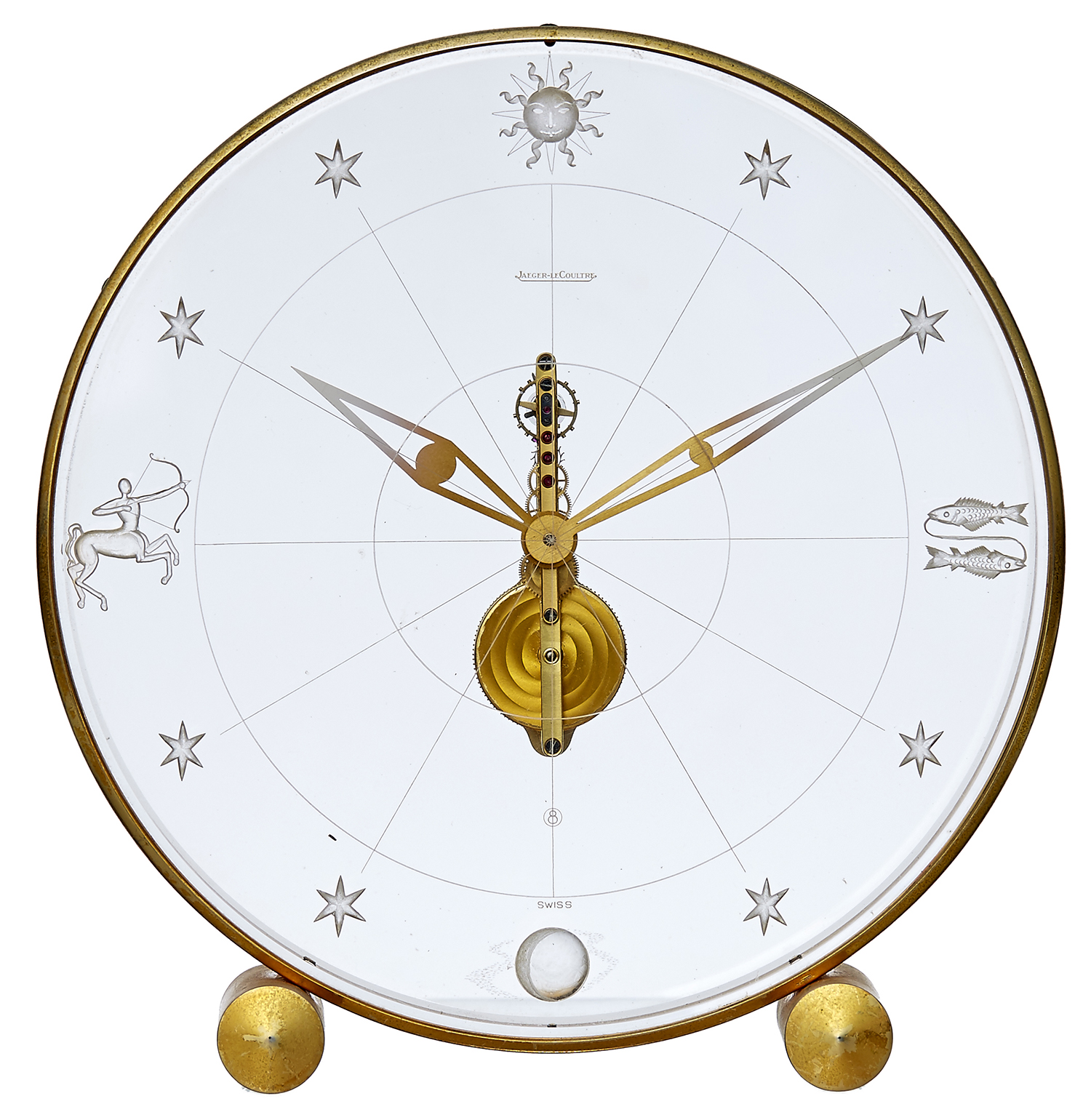 Of circular form in perspex and gilt brass, 8-day going desk clock with visible movement, transparent with etched and frosted Zodiac symbols and stars as indexes, brushed gilt skeleton lozenge hands, gilt-brass with linear wheel train, 15 jewels, straight-line lever escapement, monometallic balance, self-compensating flat balance spring.