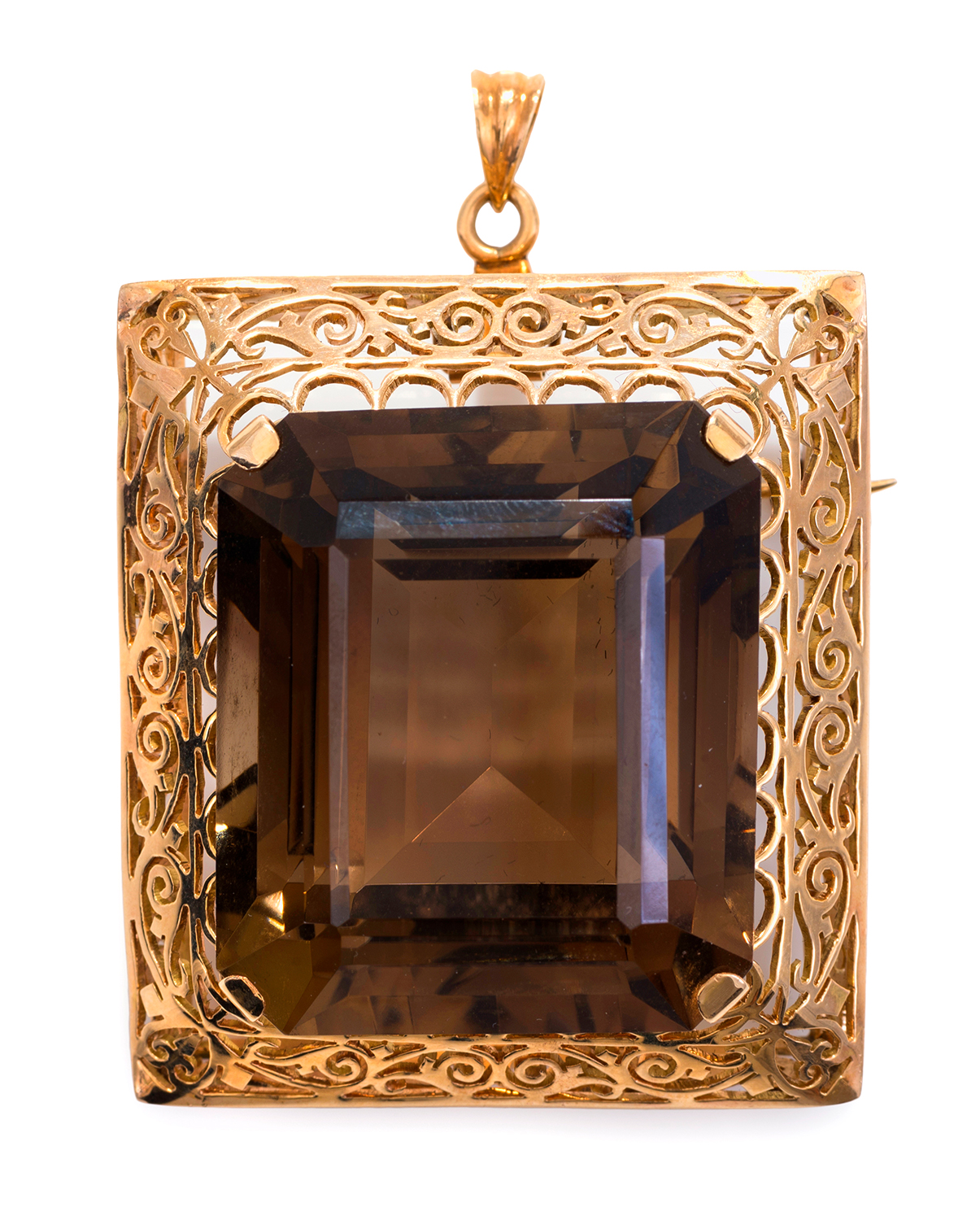 The large emerald cut smokey quartz of 160.00cts, to a pierced filigree frame, mounted in 14ct rose gold.