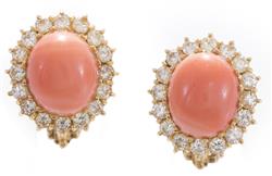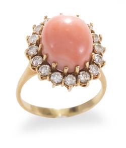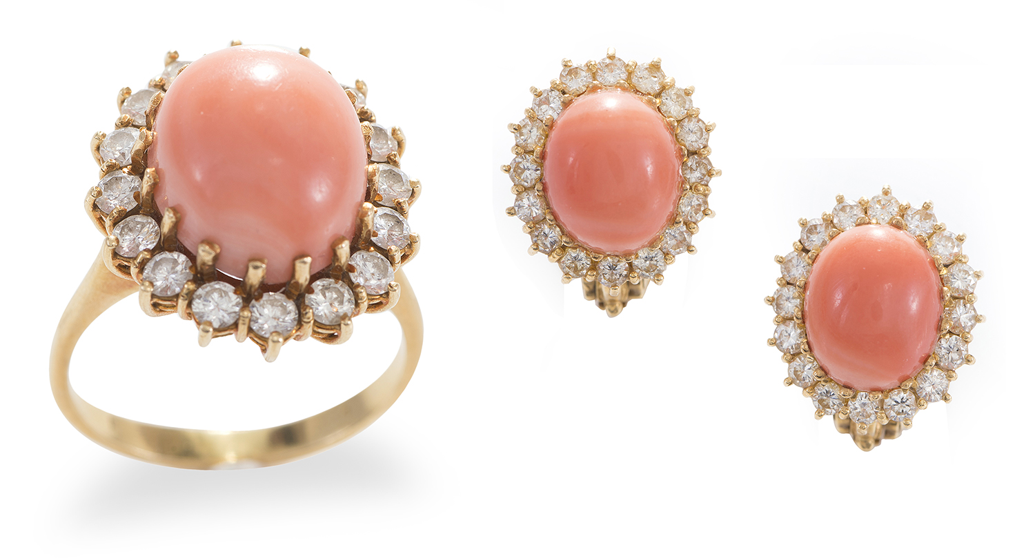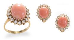 Comprising a ring and earrings, the ring set with oval pink coral cut en cabochon, set in a border of round brilliant cut diamonds, the earrings of conforming design, all mounted in 18ct gold, ring size M.