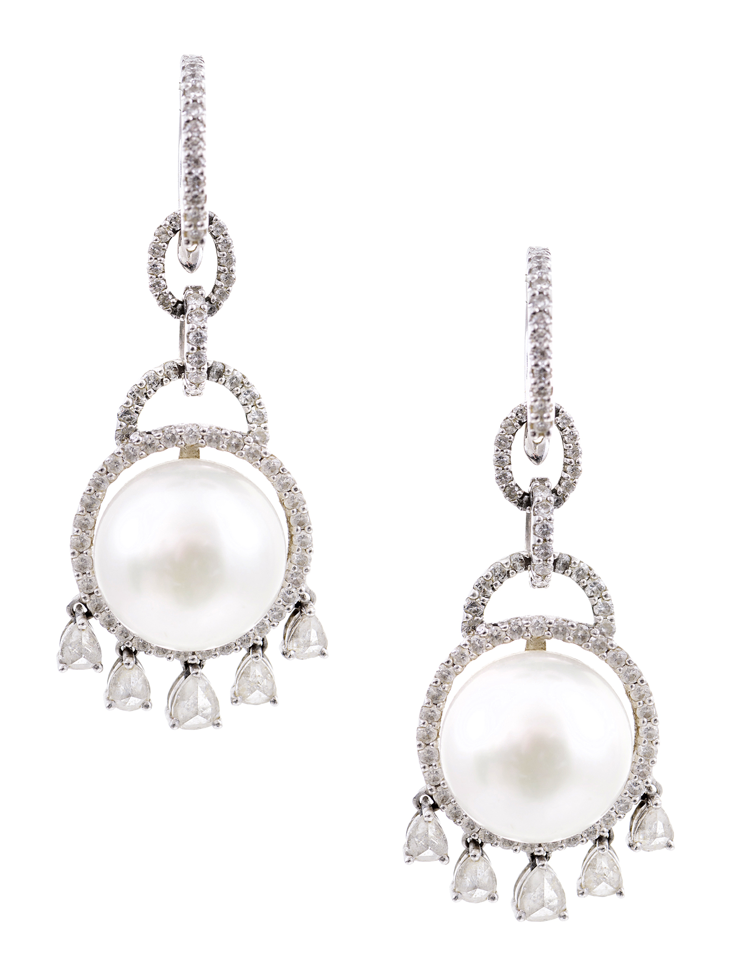 Each comprising a button pearl of silver and white hue measuring 12.9mm, surrounded and surmounted with round brilliant cut diamonds, with five further graduating pear cut diamonds, mounted in 18ct white gold, retailed by Anton jewellers.