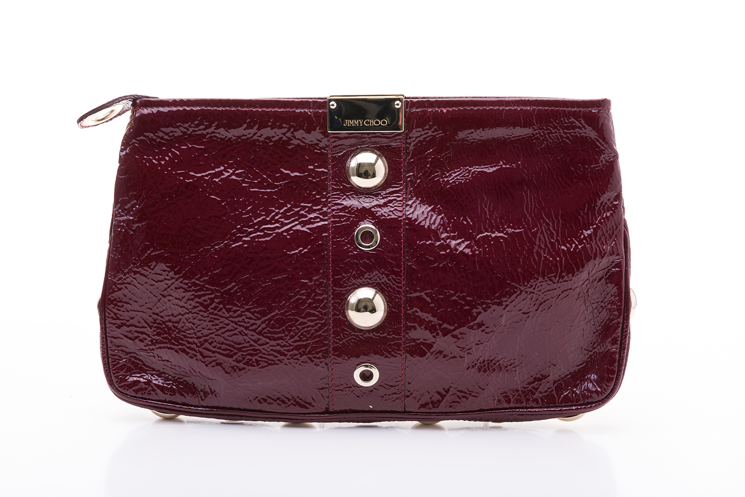 Styled in burgundy patent leather with gold metal features, 19 x 31 x 3cm.