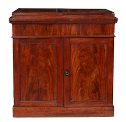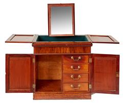 The rectangular top with hinged panels opening to reveal baize lined compartment below the ratchet lift up mirror on two cupboard doors revealing four fitted drawers to one side and cabinet on the other, on plinth base, 74 width x 51 depth x 75cm height