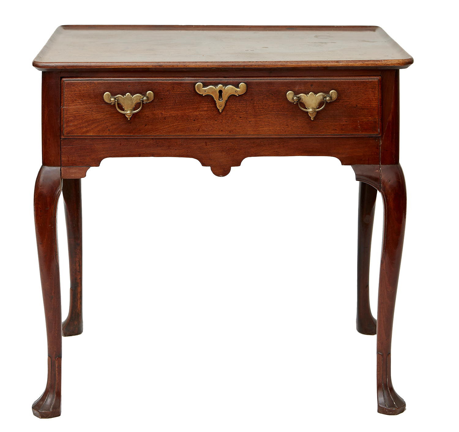 The dish top above single drawer, oak lined with compartments, the shaped apron on cabriole legs with fan carved pad feet, 75 width x 51.5 depth x 70cm height