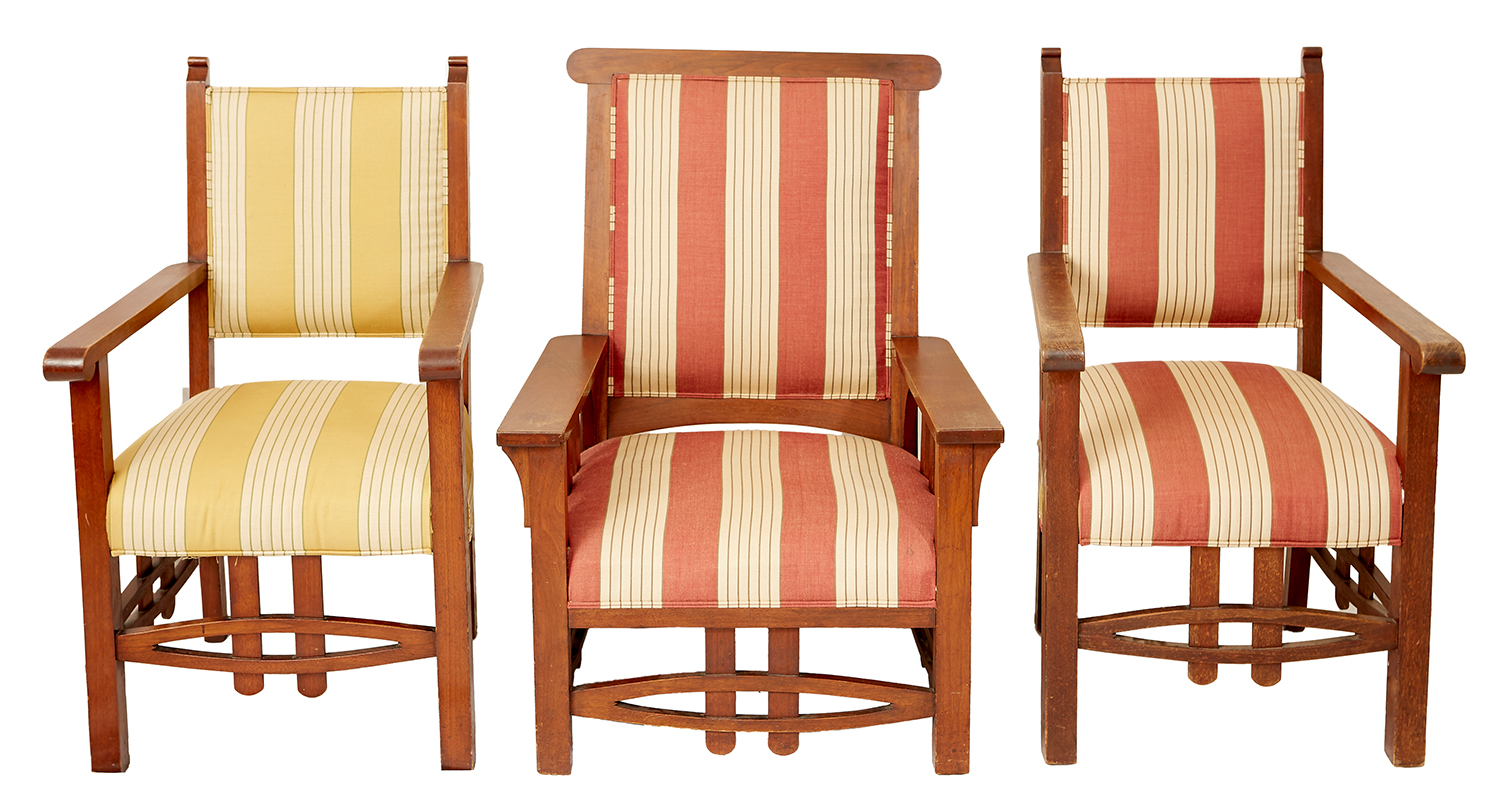 Each upholstered in striped fabric, two matched and one larger, the largest 76 width x 80 depth x 102cm height