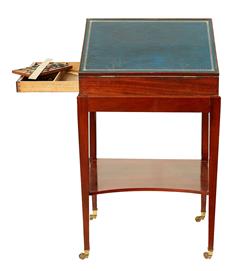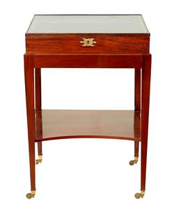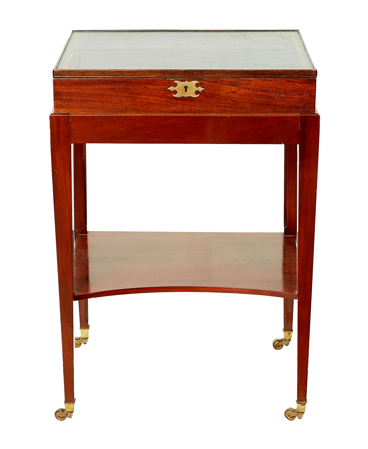 With inset tooled leather top opening to vacant compartment with adjustable brass arms, the side with inset brass handle of fitted drawer containing compartments with original paints by Reeves & Inwood and others, 53.5 width x 39 depth x 79cm height including stand
