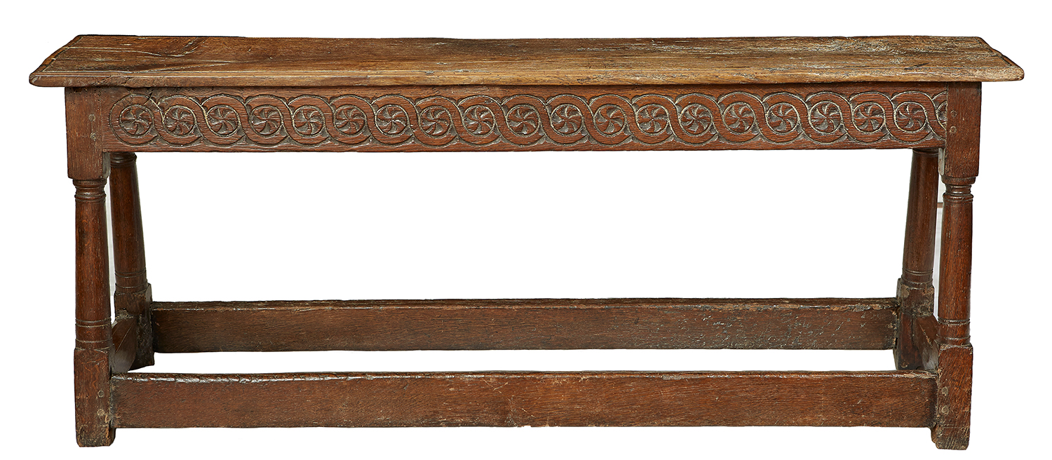 The single plank top above plain freeze, block and ring turned legs joined by stretchers,128 width x 32 depth x 51cm height