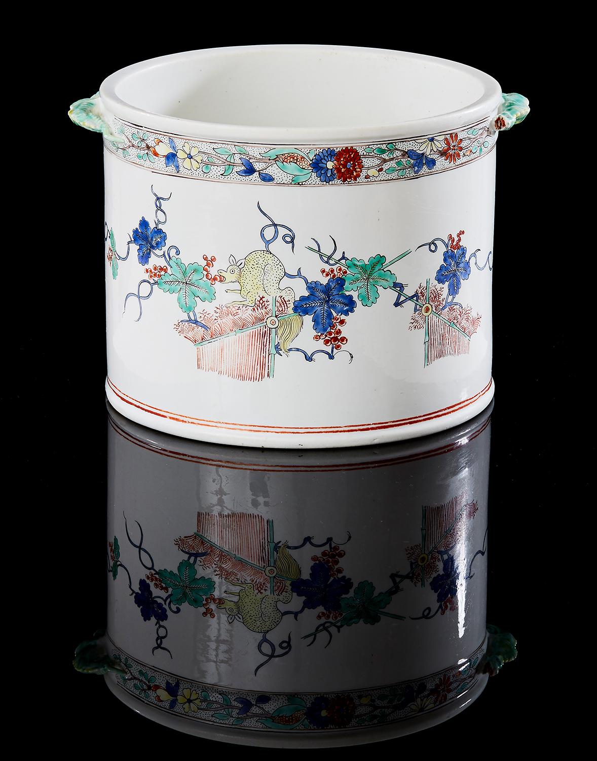 Of cylindrical form with dragon form handle mounts, painted with squirrel and Kakiemon flowers, red hunting horn mark, 16 height x 19cm diameter