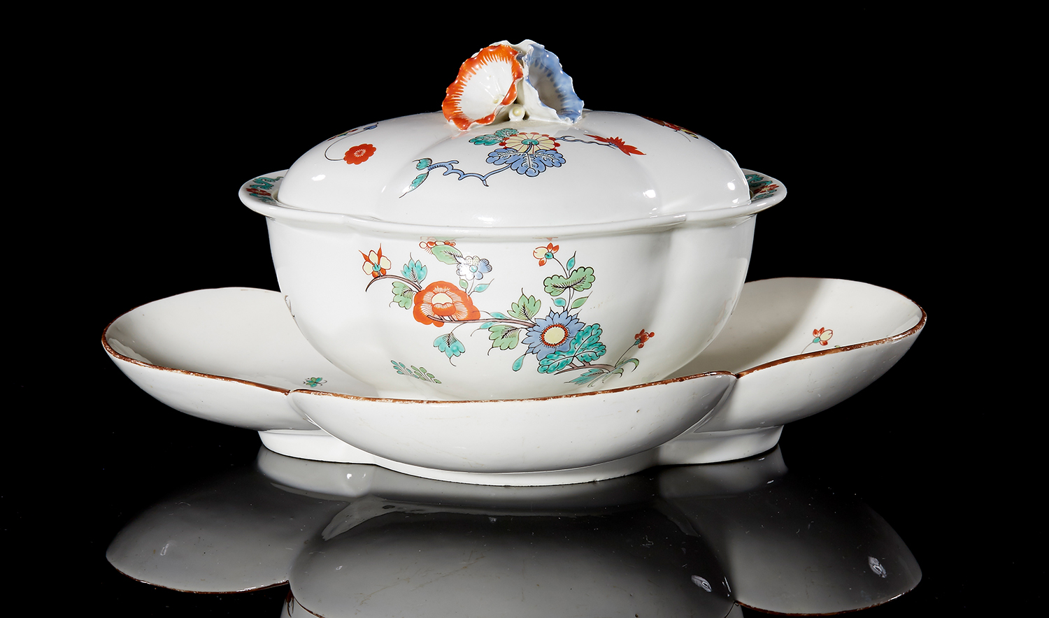 Of quatrelobed form painted with Kakiemon flowers and insects, the cover with flower knop, the tray with brown-edged rim, red hunting horn mark, tray 23.5 width, dish 15.5cm width, (2)