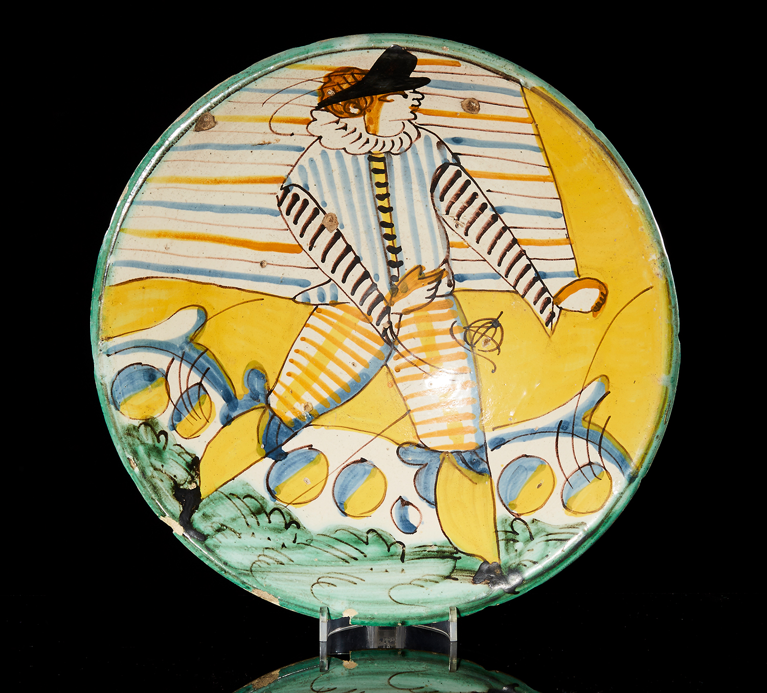 Boldly painted with stylised striding figure, 30cm diameter