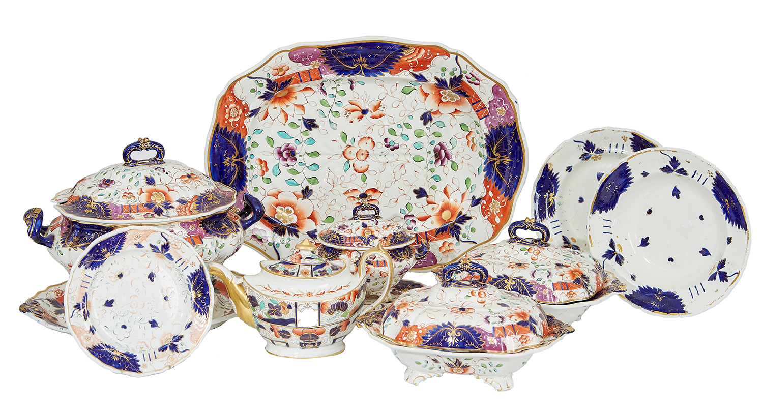 Comprising; 1 large covered soup tureen and platter, 1 small covered soup tureen, 2 covered vegetable dishes, 1 large grooved meat platter, 1 small platter, 1 teapot, 18 dinner plates, 9 soup bowls, and 8 side plates (42)