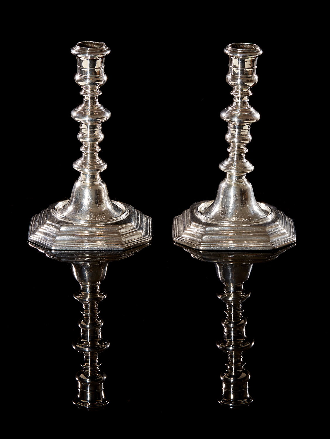 Each on stepped base with canted corners, the turned stem terminating in spool shaped socket, the base engraved with coat of arms, 667 grams, 16.8cm high