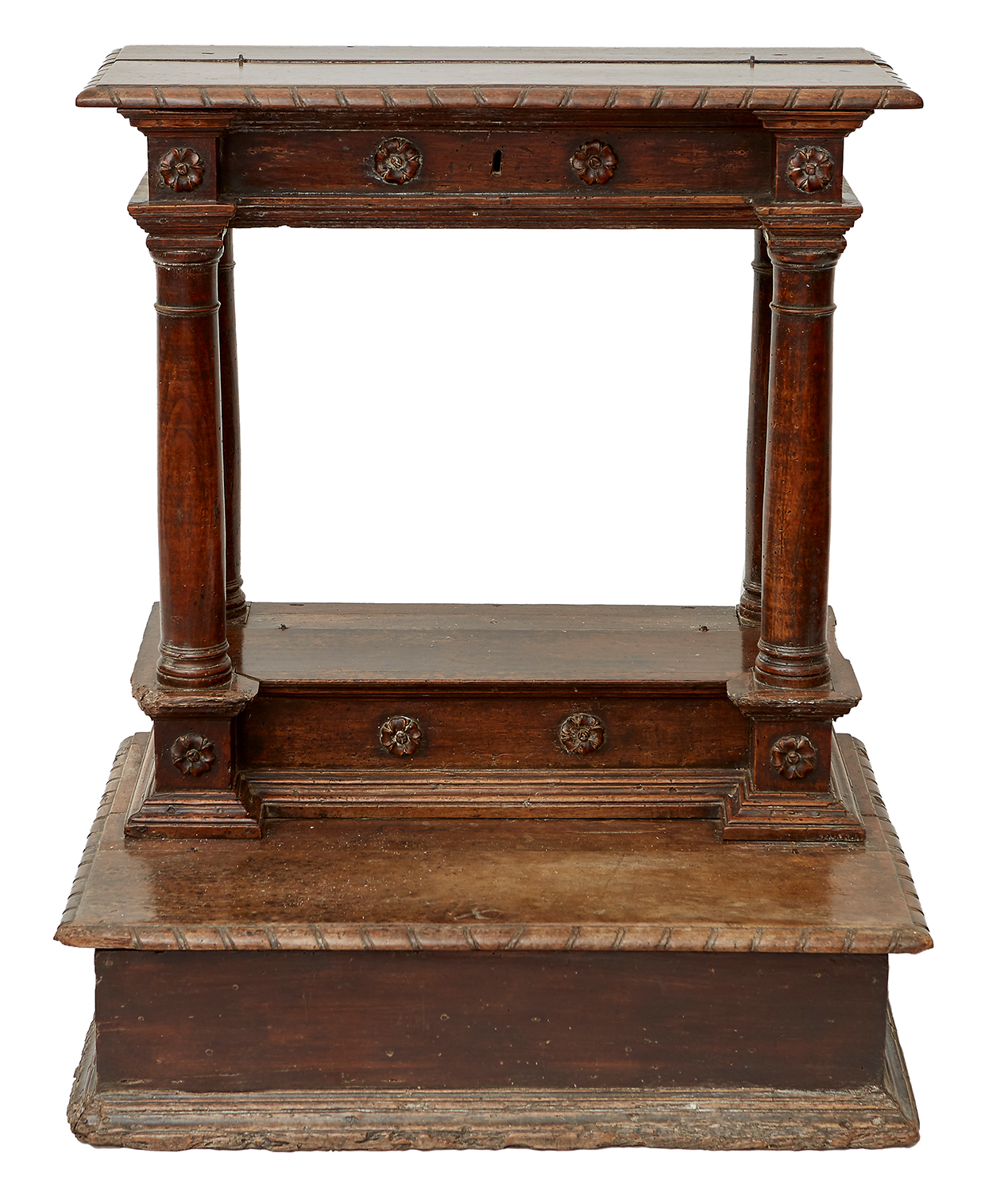 The hinged top with gadrooned edge above frieze with rosettes, supported by columns on platform base with hinged lid on moulded plinth, 75 width x 55 depth x 86cm height