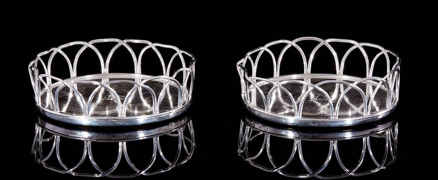 Of restrained form with reeded wirework gallery, the silver well with engraved 'Arm & Anchor' crest mounting a turned wooden base, 14cm diameter