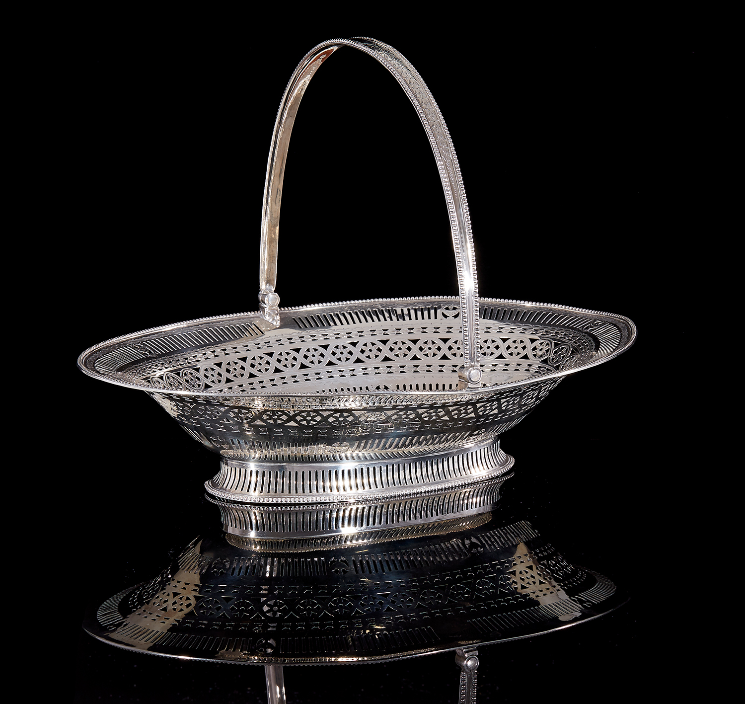 Of Neoclassical design with pierced, engraved and bright cut detailing, engraved with crest to well, 36.5cm width, 739 grams