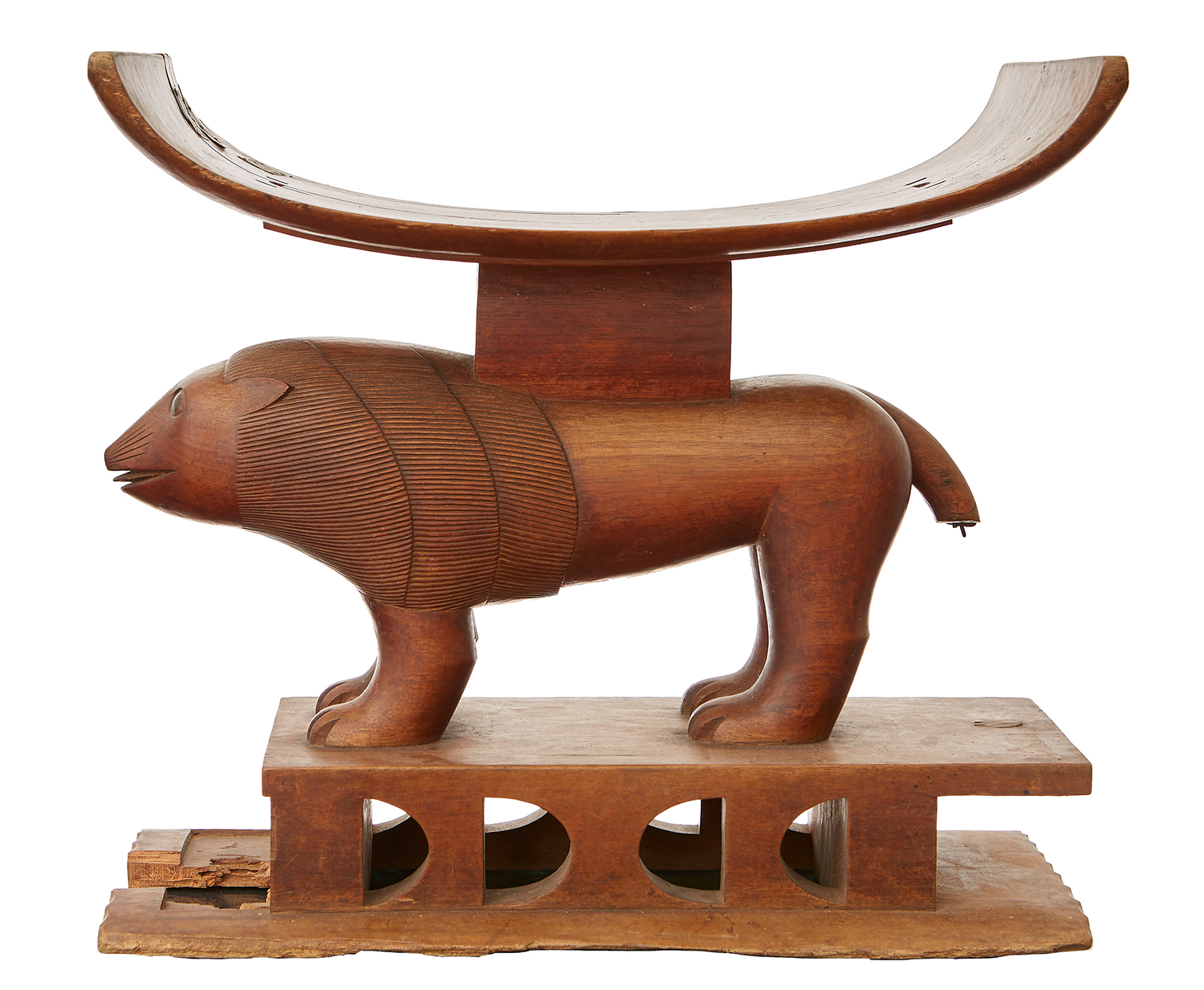 Made for chiefly use, the base of the seat of the stool carved in the form of a standing male lion, an animal of great power and majesty, the curved seat with native repair and a worn patina, 59 width x 37 depth x 55cm height